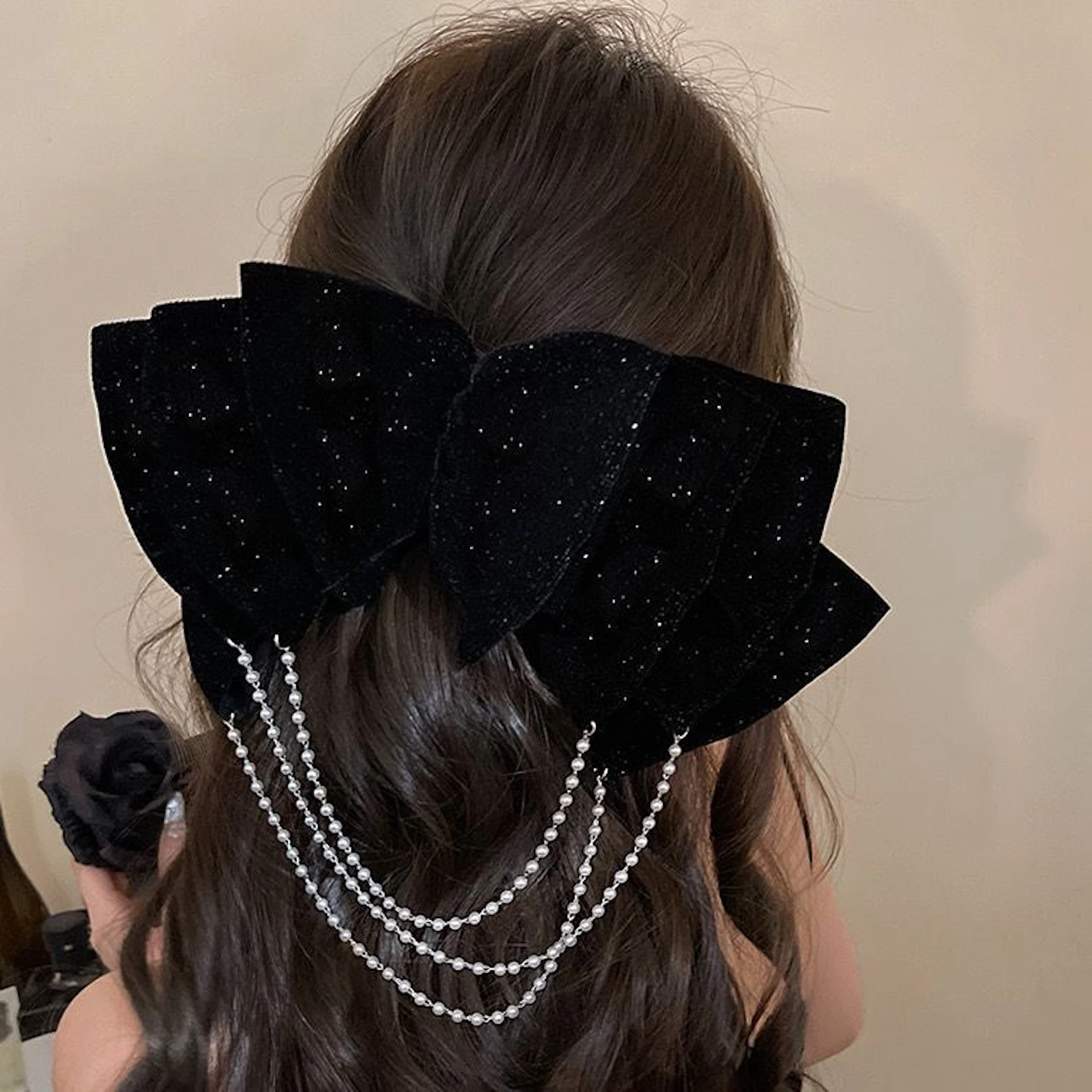 Siyah Kadife Simli Büyük Fiyonk Toka – İnci Zincir Detaylı Yılbaşı Saç Aksesuarı