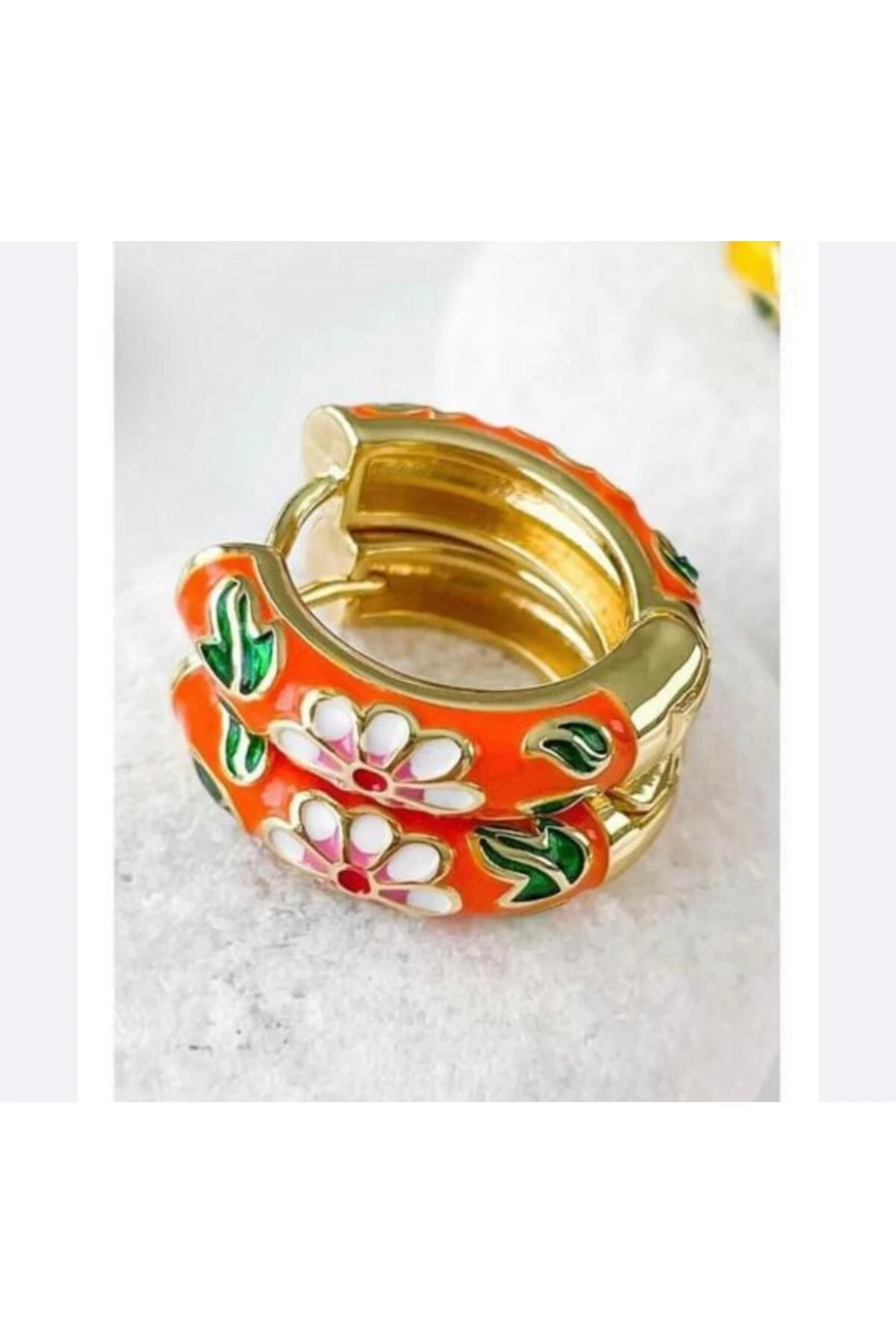 Turuncu renk; enerji, yaratıcılık ve mutluluğu simgeler. Canlı ve neşeli yapısıyla dikkat çeken bu renk, takıldığı anda stilinizi aydınlatır. Pembe-beyaz çiçek desenleri ise feminenliği, doğallığı ve sadeliği temsil eder. Yeşil yapraklar tazelik ve yenilenme hissi uyandırır. Bu küpe modeli; doğayla iç içe, pozitif ve zarif kadınlara hitap eder. Turuncu zeminin sıcak etkisi, çiçek motifleriyle buluşarak hem samimi hem şık bir görünüm sunar.