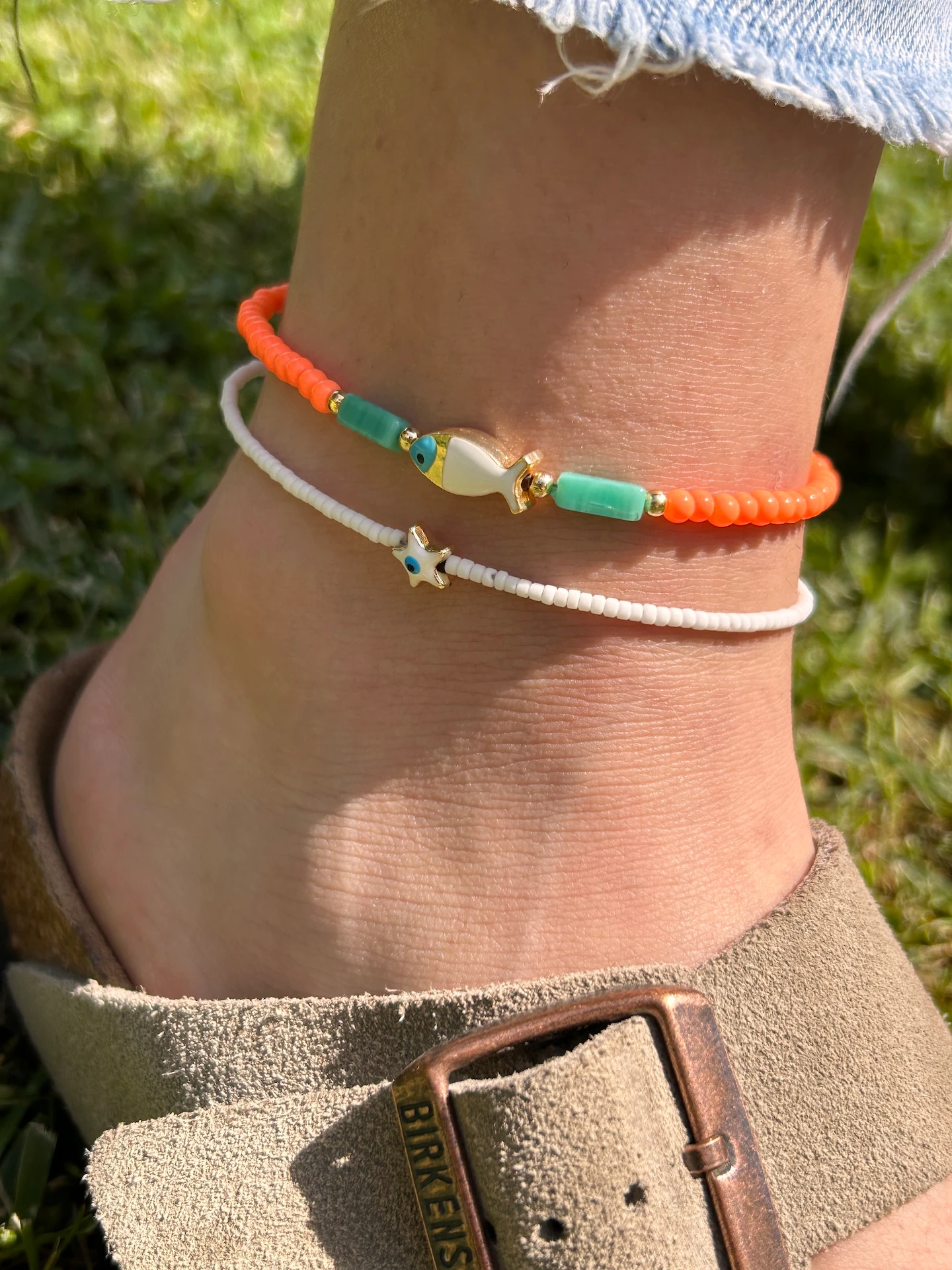 Neon tonların enerjisi, balık figürünün sevimliliği ve beyaz boncuk halhalın zarafeti bu sette buluşuyor. İster sandaletlerinizle, ister yalınayak sahil yürüyüşlerinde bu iki parçalı halhal setiyle kombinlerinize özgünlük katabilirsiniz. Ayrıca halhalın balık figürü, deniz temalı takıları sevenler için ideal bir detay sunuyor.